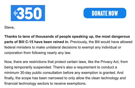 Congrats to 350 Canada and their allies for winning amendments to Bill C-15 that make it much harder for Big Oil to slip through backroom exemptions. |